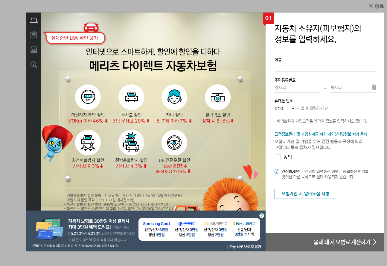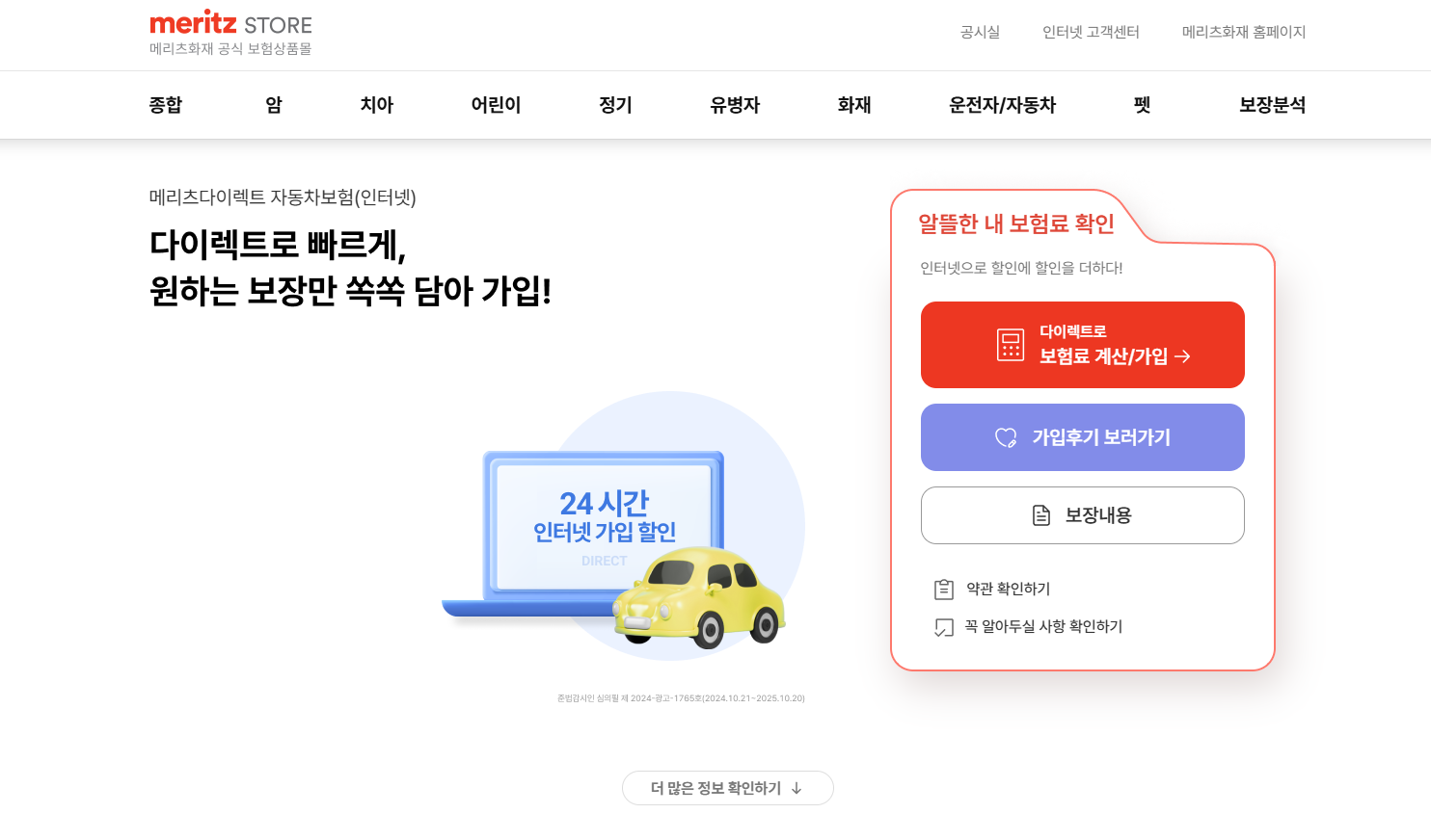 메리츠화재 다이렉트 자동차보험 공식 사이트에서 예상 보험료를 계산합니다.