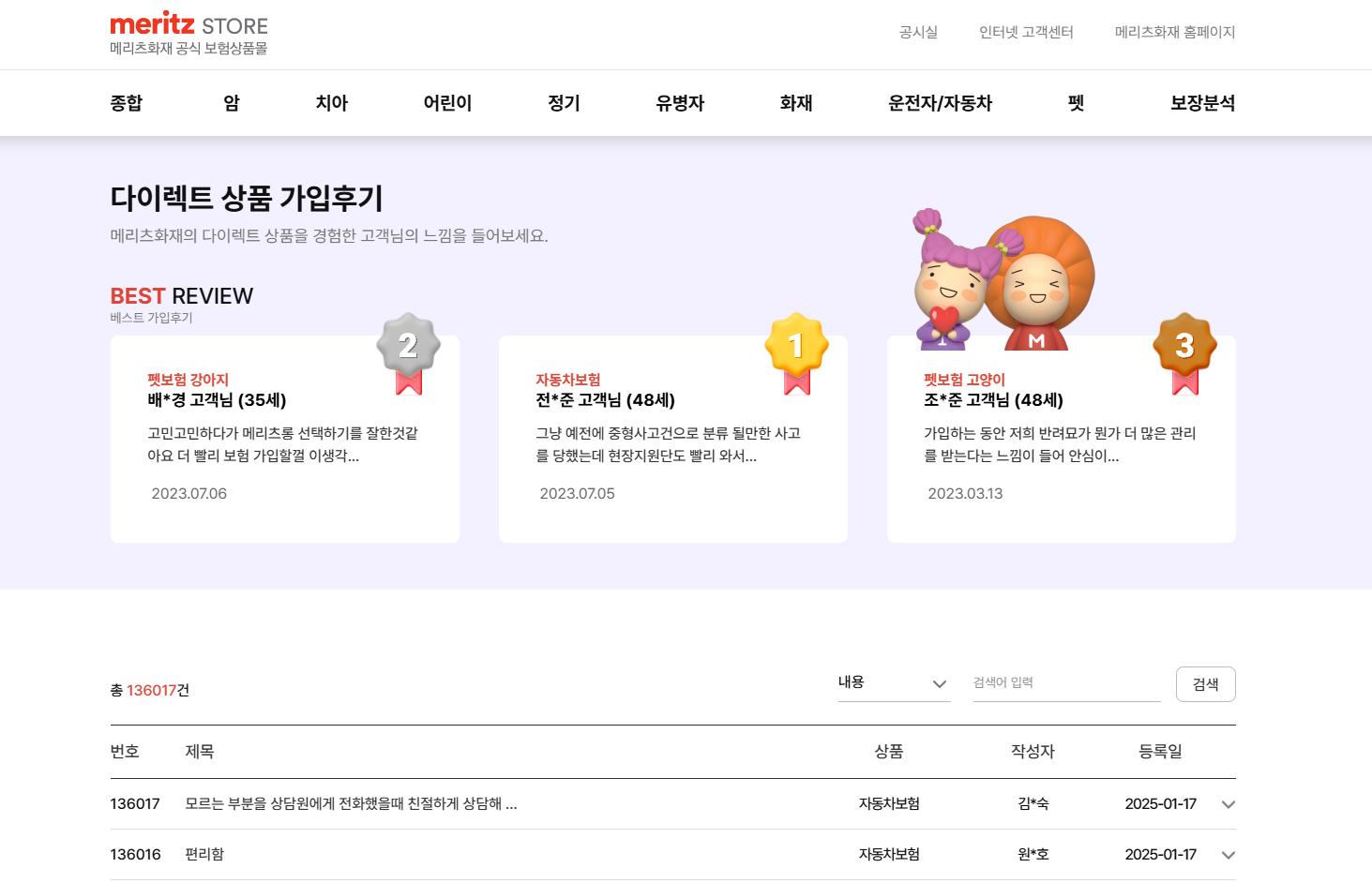 메리츠화재 자동차보험은 고객들로부터 높은 평가를 받고 있습니다. 특히 할인 특약을 통한 경제적인 보험료와 신속한 사고 처리 서비스가 많은 고객들에게 호평을 받고 있습니다. 고객들은 또한 다이렉트 가입의 간편함과 다양한 특약 선택 옵션에 대해 긍정적으로 평가하고 있습니다.
